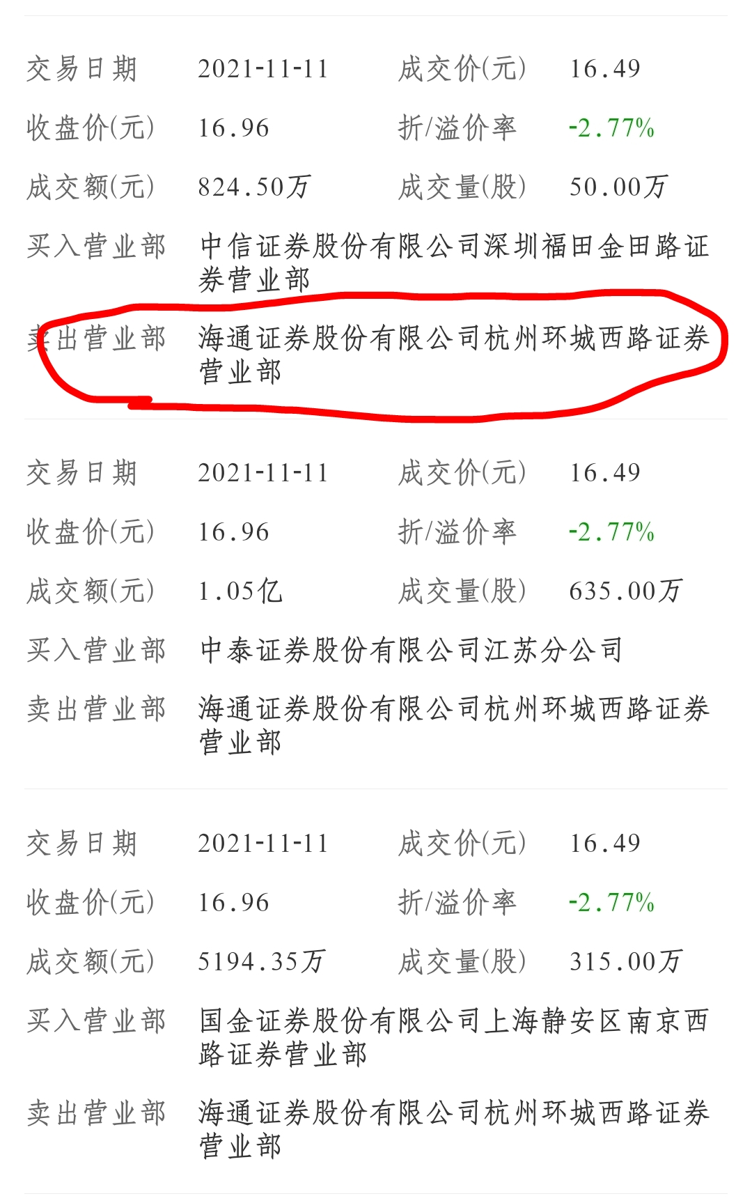 最后在吧里回复一次,那些说这次大宗交易是二股东卖出的吧友,2021年11月11日,二股东通过大宗交易减持卖出的营业部是中信证券杭州环城西路,这次是浙商证券。