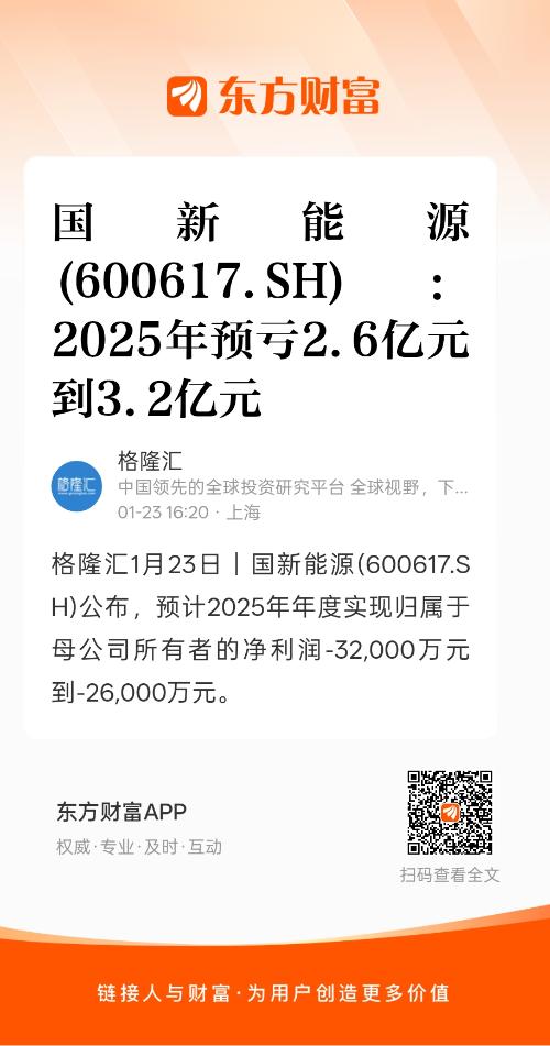 格隆汇1月23日丨国新能源(600617.SH)公布,预计2025年年度实现归属于母公司所有者的净利润-32,000万元到-26,000万元。
