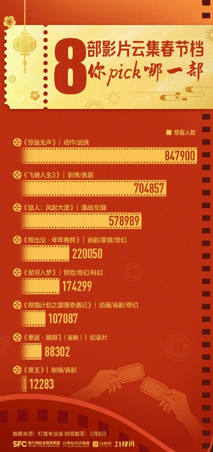再加上现在是春节假期前的最后一周,春节档目前集结了8部影片,镖人、星河入梦、惊蛰无声、飞驰人生3等,这几部片子挺让人期待。