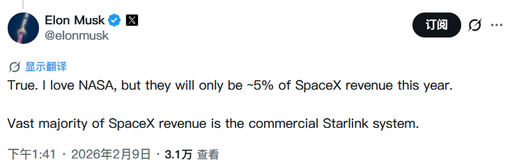 马斯克透露,过去一年来自NASA的订单只占SpaceX营收的约5%,而SpaceX的绝大部分收入来自