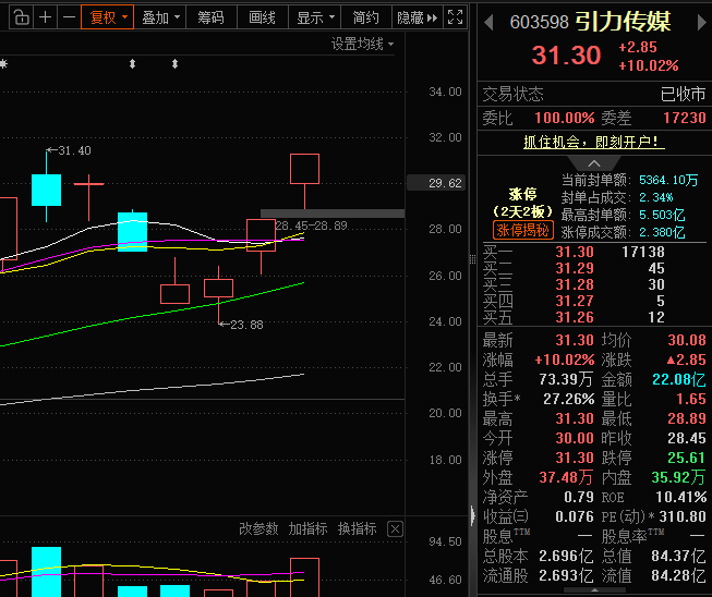 今日高开涨幅5.45%,然后快速下探释放分歧,大概十点零四分左右股价再28.89位置企稳并且承接有力,我也是看到直接进场,再次喜提涨停板!