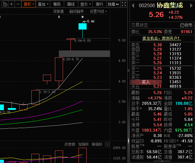 集合竞价冲高后触及涨停附近没多久又快速跳水,5.41的位置开盘,随后股价依然震荡下行,早上我也说过今天以防守为主,按照原先的交易计划,期间止盈了部分仓位。