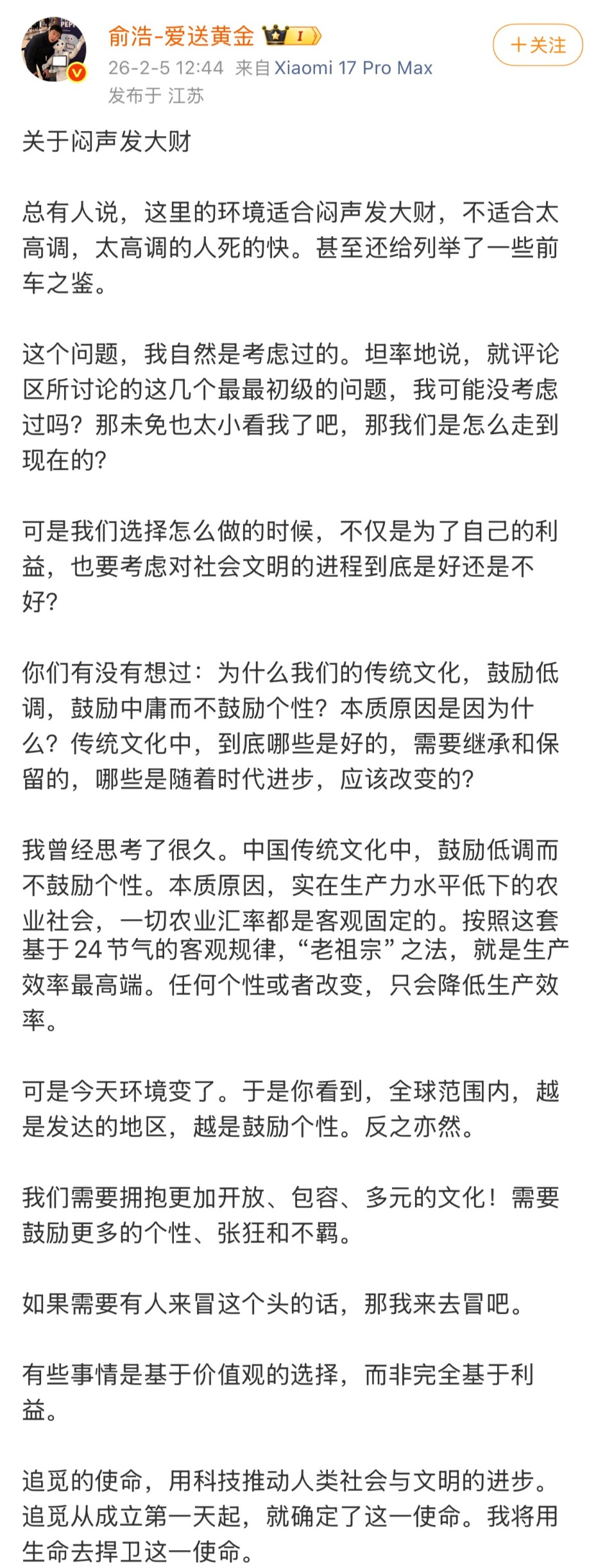 俞浩最近成为了网络红人。上场之前,他还忙着在微博上送黄金、抽锦鲤,在各种追觅的流言下和网友交流辩论。他近期一条出圈的朋友圈是:“我想把人类价值最高的企业再推高一个数量级,把追觅生态做到一百万亿美金量级。”