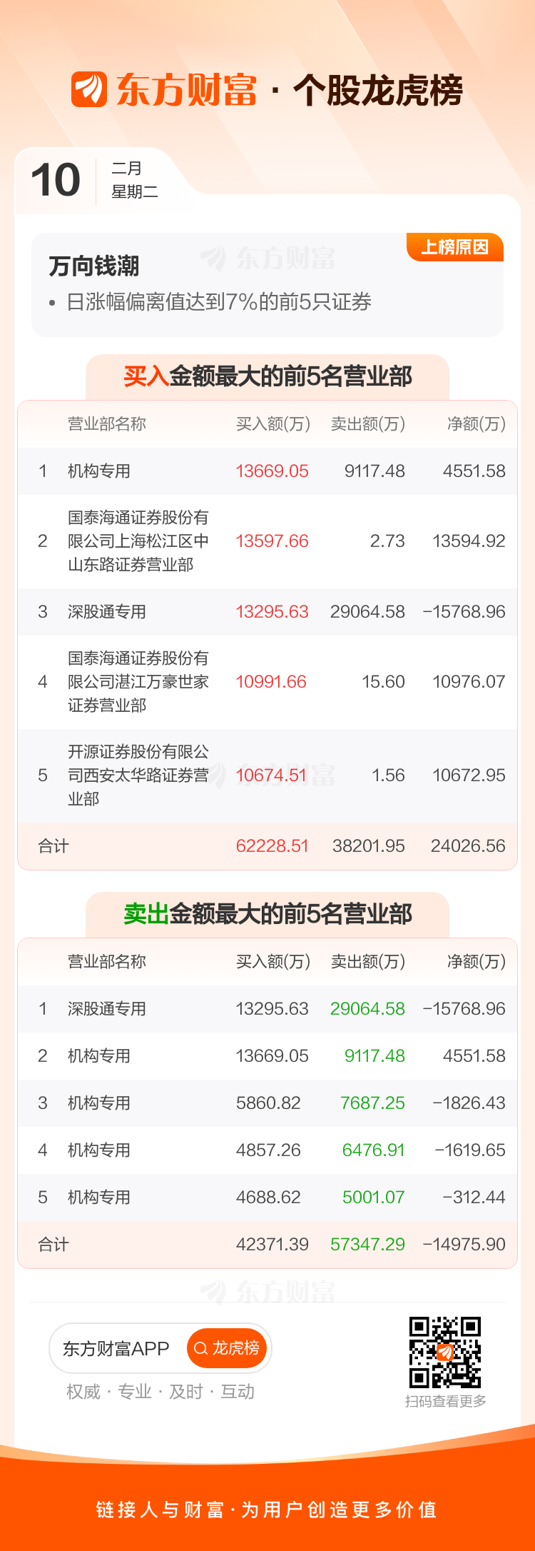 交易所2026年2月10日公布的交易公开信息显示,万向钱潮因成为日涨幅偏离值达到7%的前5只证券上榜。万向钱潮当日收报19.53元,涨跌幅10.03%,偏离值9.95%,换手率6.93%,成交额42.56亿。