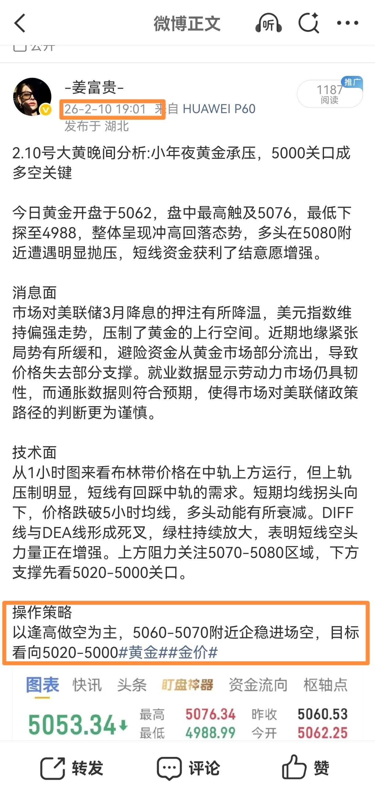 富贵晚间提示的逢高做空,行情在5057附近企稳后如期下行,最低触及5019,精准