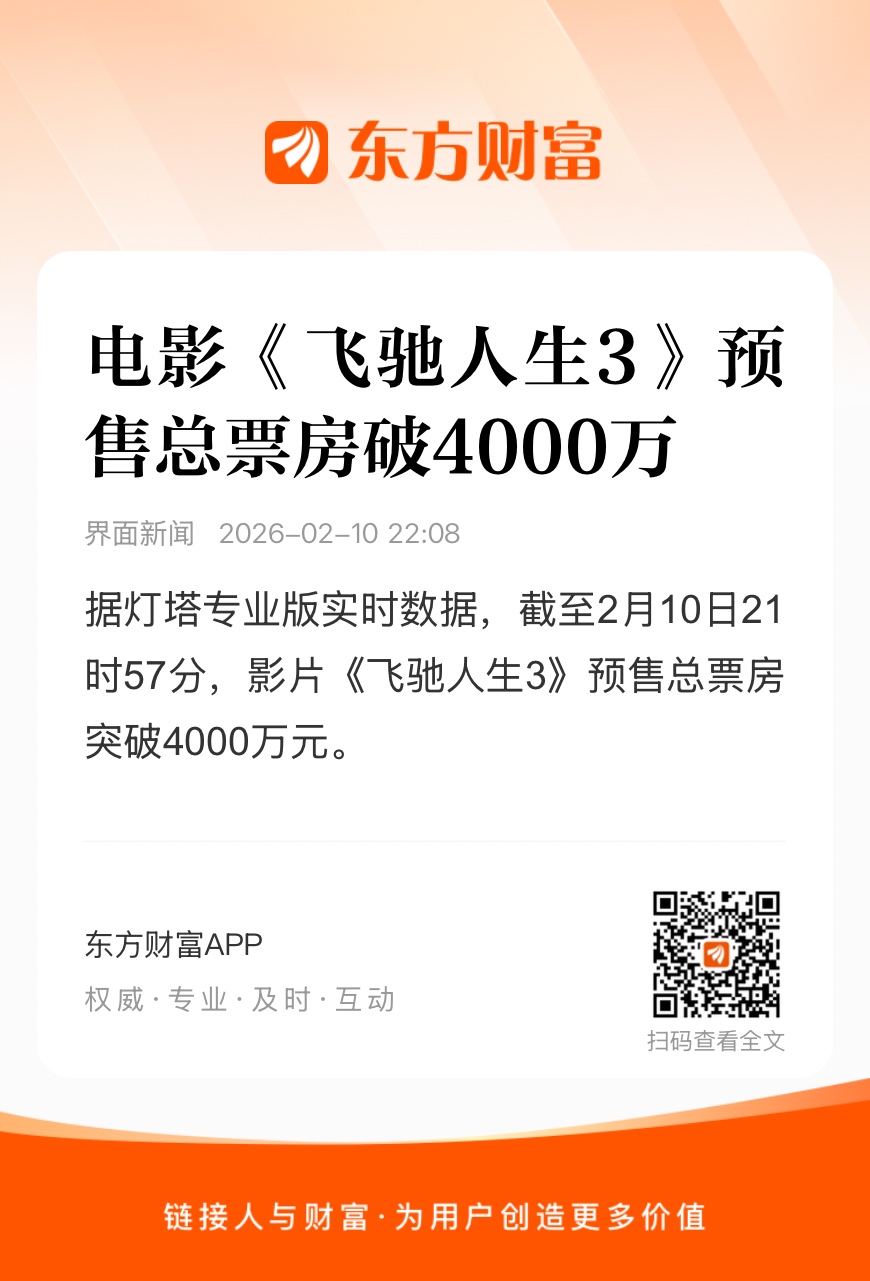 据灯塔专业版实时数据,截至2月10日21时57分,影片《飞驰人生3》预售总票房突破4000万元。