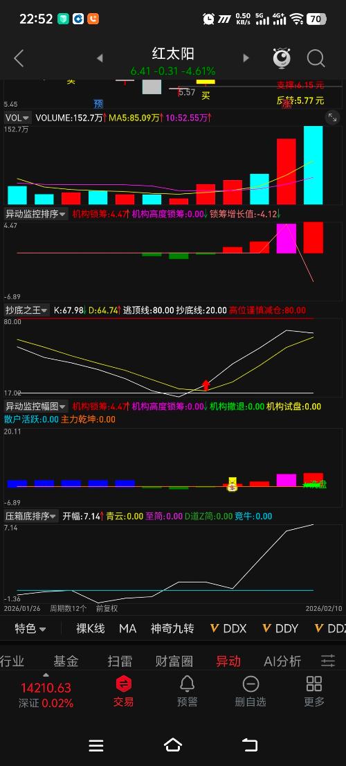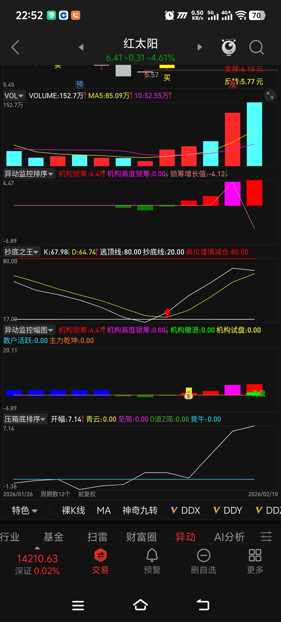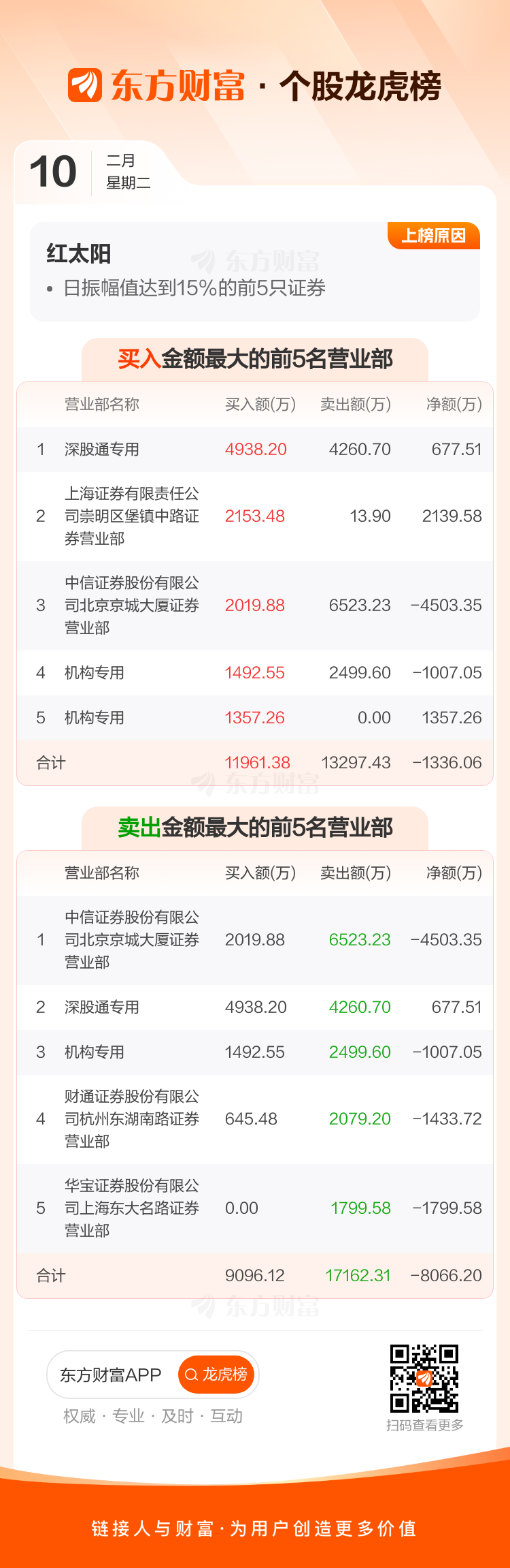 交易所2026年2月10日公布的交易公开信息显示,红太阳因成为日振幅值达到15%的前5只证券上榜。红太阳当日收报6.41元,涨跌幅-4.61%,偏离值15.38%,换手率13.74%,成交额10.35亿。