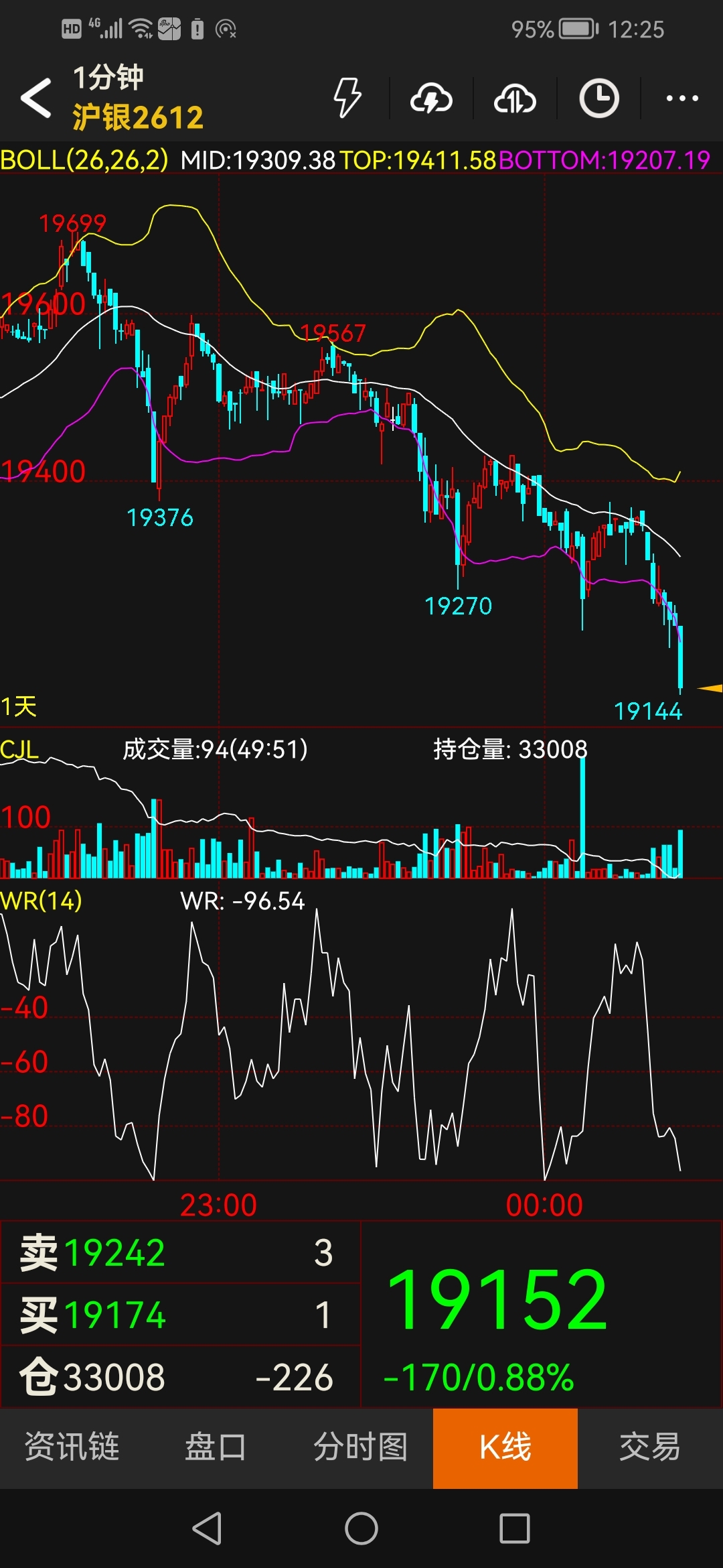 从沪银2612合约的BOLL通道看,中轨22487.35已被远远抛在身后,价格在触及30000高点后急转直下,暴跌至16443低点,随后虽有反弹至19742,但反弹力度明显疲弱,VR指标仅为99.60,显示市场参与度不足。