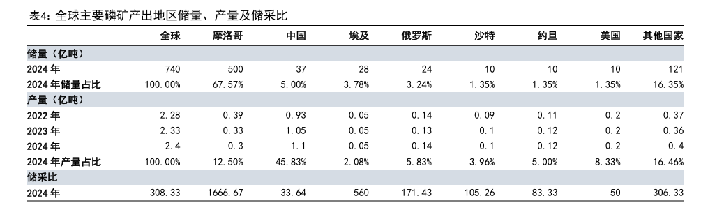 2005-2016年开采量快速扩张,但2016年长江大保护上升为国家战略后,沿线磷矿及磷化工企业整治力度加大,全国磷矿石产量在2017-2020年连续下滑;2021-2024年虽略有回升,但受多年高强度开采影响,富矿资源加速枯竭,整体品位持续下降。叠加环保督察与安全生产政策趋严,如2022年国家矿山安监局推动部分安全生产不达标中小产能退出,磷矿山开工率长期低位运行,供给端刚性约束日益凸显。中国以全球5%储量支撑近半产量,资源保障压力突出,稀缺属性持续强化。中国磷矿石以全球约5%的储量贡献了全球45.8%的产量,储采比仅为33.6,远低于摩洛哥的1667,资源透支严重。据美国地质调查局数据,2024年全球磷矿储量740亿吨,其中摩洛哥占67.6%(500亿吨),但其因基础化工产业薄弱,产量仅占全球12.5%;而中国储量仅37亿吨,却年产超1.1亿吨,且整体品位仅17%,可采储量平均品位亦不足23%,显著低于全球30%的平均水平。在新能源需求大增与国内供给增长受限的双重作用下,磷矿石稀缺性不断强化,预计价格中枢将长期维持高位。