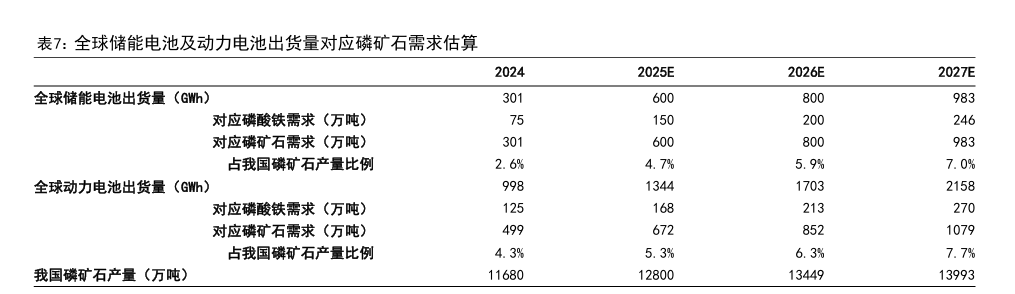 在全球储能产业加速扩张的背景下,磷酸铁锂对上游磷资源的需求持续提升。我们假设全球储能电池和动力电池中采用磷酸铁锂技术路线的比例分别为100%和50%。按行业经验值,每GWh磷酸铁锂电池约消耗0.25万吨磷酸铁(FePO4),使用4吨磷矿石/吨磷酸铁的单耗,推算对应的磷矿资源需求。参考InfoLink对储能电池出货量的预测(2025/2026年约600/800GWh),SNEResearch公布2025年前三季度全球动力电池总装车量约同比增长34.7%,以及弗若斯特沙利文对全球动力/储能电池行业2025-2029年的预测复合增速分别为26.7%/22.9%,假设全球储能电池出货量在2025-2027年分别增至600/800/983GWh,对应磷矿石需求将升至600/800/983万吨,占我国磷矿石预测产量比重分别达到4.7%/5.9%/7.0%;同期全球动力电池出货量将增至1344/1703/2158GWh,对应磷矿石需求升至672/852/1079万吨,占我国磷矿石预测产量比重分别达到5.3%/6.3%/7.7%。储能级磷酸铁对原料纯度要求高(低铁、低镁、低重金属),实际可适配的高品位磷矿资源远比总量稀缺,叠加动力电池的持续贡献,磷资源在新能源电池领域的消费比重将持续提升。因此,具备优质矿源及“矿化一体”能力的企业将在新能源材料竞争中占据显著战略优势。$川恒股份(SZ002895)$$百川股份(SZ002455)$$中毅达(SH600610)$