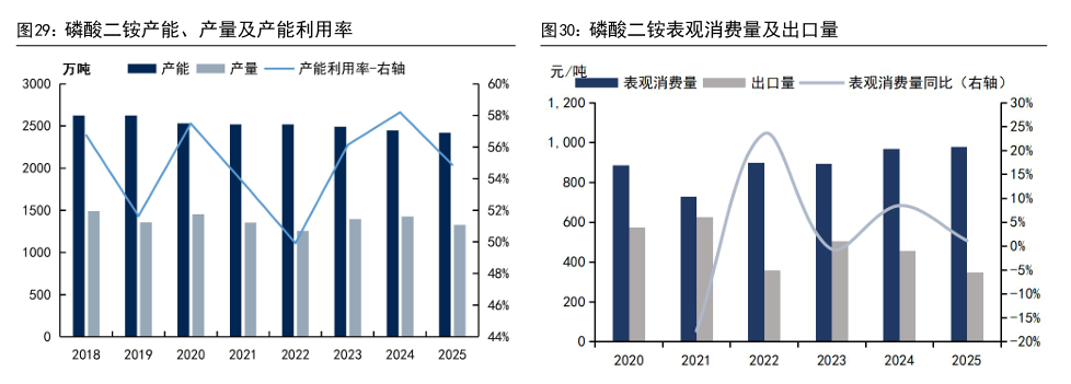 2018-2025年,中国磷酸二铵行业产能呈稳步收缩态势,产量与产能利用率随出口政策、农业刚需等因素呈同步波动走势。2019年后受环保整治、行业产能优化调整影响,产能走低;2022年受出口配额收紧、法检政策落地等因素冲击,产量跌至1258万吨的低点,产能利用率下探至50%;2023-2024年产能持续小幅收缩,出口政策边际宽松叠加农业刚需释放,产量逐步回升,2024年产能利用率回升至58%;2025年产能进一步收缩至2419万吨,受下游需求疲软、出口量减等因素影响,产量小幅回落,产能利用率同步下行至55%。在行业产能稳步收缩、需求结构持续优化的背景下,磷酸二铵行业通过存量产能调整与需求端刚需支撑逐步实现供需再平衡,但受农业需求增长放缓、出口政策偏紧等因素制约,行业短期内难回高景气周期。