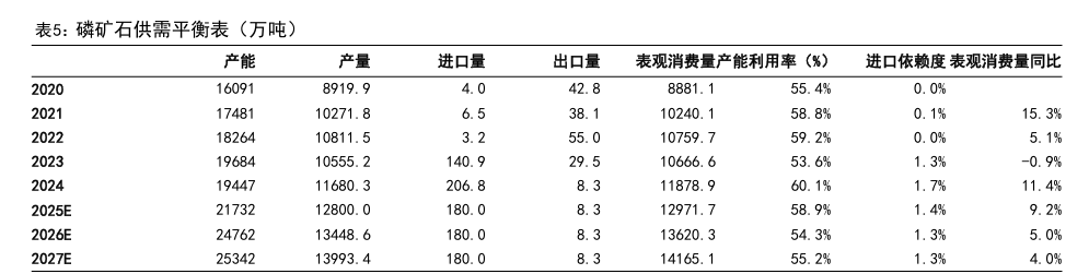 磷矿石产量创六年新高,但有效供给仍受制于结构性瓶颈。据百川盈孚,2020-2024年,我国磷矿石名义产能由1.61亿吨增至1.94亿吨,但实际供给能力远低于账面水平。2024年全国产量达1.14亿吨,为2018年以来最高值;表观消费量同步攀升至1.19亿吨,同比增长11.4%,部分受益于磷酸铁锂等新能源材料需求快速扩张。然而,据百川盈孚统计,当前有效产能仅约1.19亿吨/年,与1.94亿吨的名义产能之间存在高达0.75亿吨的闲置差额,反映大量产能因环保约束、矿权审批滞后、品位过低或缺乏配套加工能力而难以释放。行业集中度低,生产企业约273家,CR8仅33.4%,以及中小矿山开工受限,进一步制约供给弹性。新增产能落地率或较为有限,进口难改紧平衡格局。尽管2025-2027年规划新增名义产能合计达0.59亿吨,但结合历史经验及当前政策环境、矿山开采难度及品位限制等情况,预计实际有效新增产能落地比例可能不足40%,即三年仅约0.24亿吨以内能形成真实供应。与此同时,进口虽在2024年增至207万吨(同比+46.8%),但占消费比重仍低于2%,且受内陆主产区运输成本制约,进口矿难以形成有效补充。综合来看,2025-2027年磷矿石表观消费量或将稳步升至1.42亿吨,而有效供给增速有限,供需紧平衡格局和价格高位运行态势有望持续。