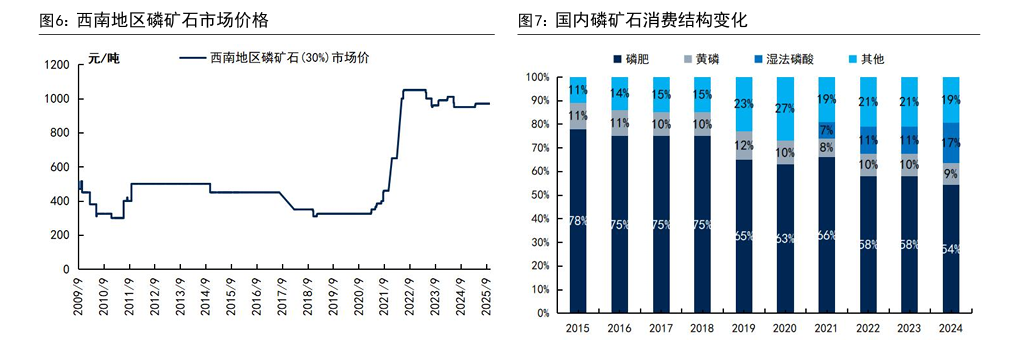 磷矿石消费结构持续演变,新能源驱动需求增量。近年来,我国磷矿石消费结构发生显著变化,传统农业需求仍为刚性支撑,但占比逐年下降。2015年磷肥占磷矿石消费总量的78%,至2024年已降至54%,反映出“减肥增效”政策与化肥使用效率提升对农业用矿的抑制;与此同时,以湿法磷酸为代表的新能源材料应用快速崛起,其消费占比从2021年的7%跃升至2024年的17%,成为磷矿石边际需求增长的核心驱动力。该部分主要用于生产磷酸铁、磷酸铁锂等新能源材料,受益于新能源汽车和储能市场的爆发式发展,带动对高品位、可净化磷矿的需求激增。黄磷消费占比稳定在8%-11%之间,其他用途(如氟化工、水处理)也逐步拓展