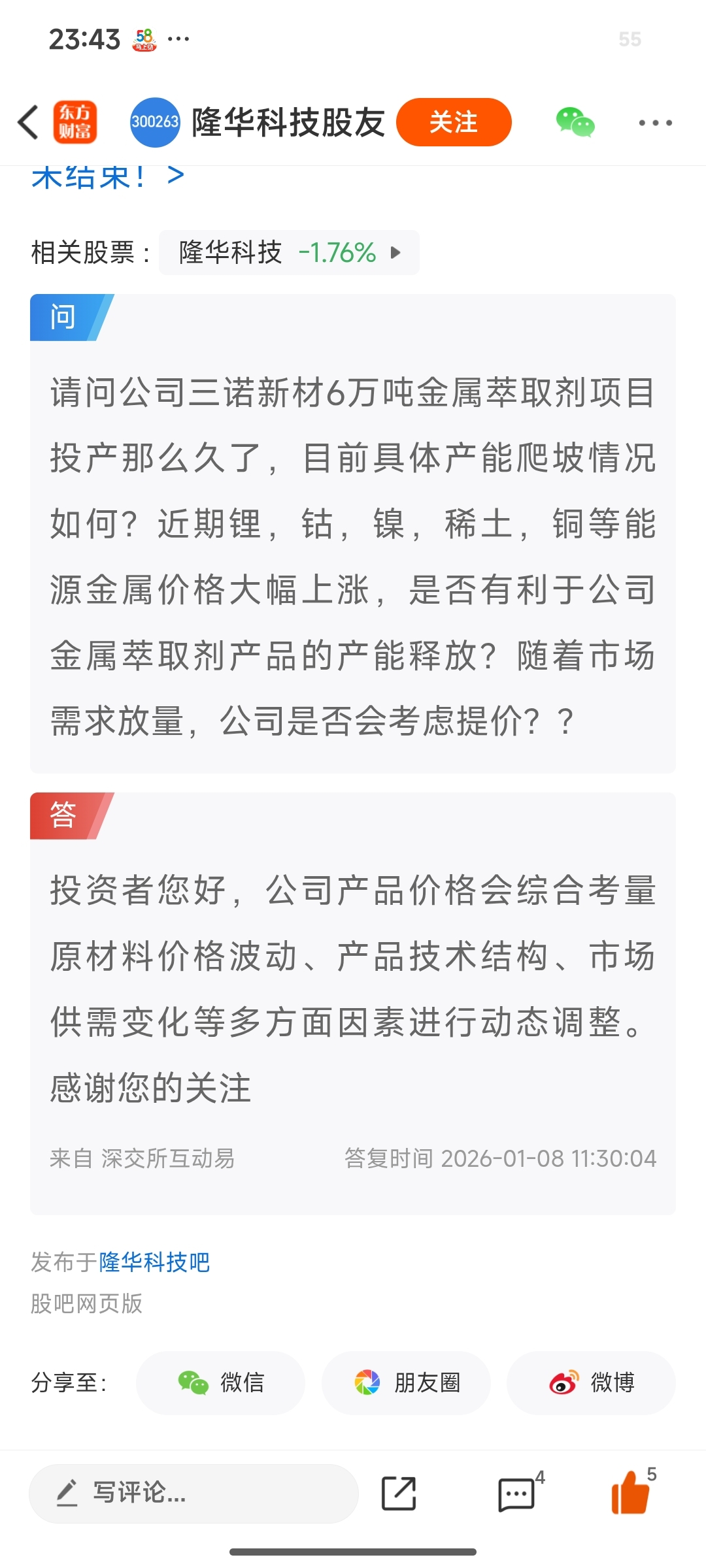 隆华科技于1月8日在投资者互动平台直接回应: 公司产品价格会综合考量市场供需变化、原材料波动、技术结构等因素进行动态调整。