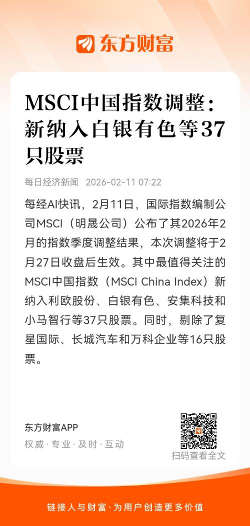 每经AI快讯,2月11日,国际指数编制公司MSCI(明晟公司)公布了其2026年2月的指数季度调整结果,本次调整将于2月27日收盘后生效。其中最值得关注的MSCI中国指数(MSCI China Index)新纳入利欧股份、白银有色、安集科技和小马智行等37只股票。同时,剔除了复星国际、长城汽车和万科企业等16只股票。