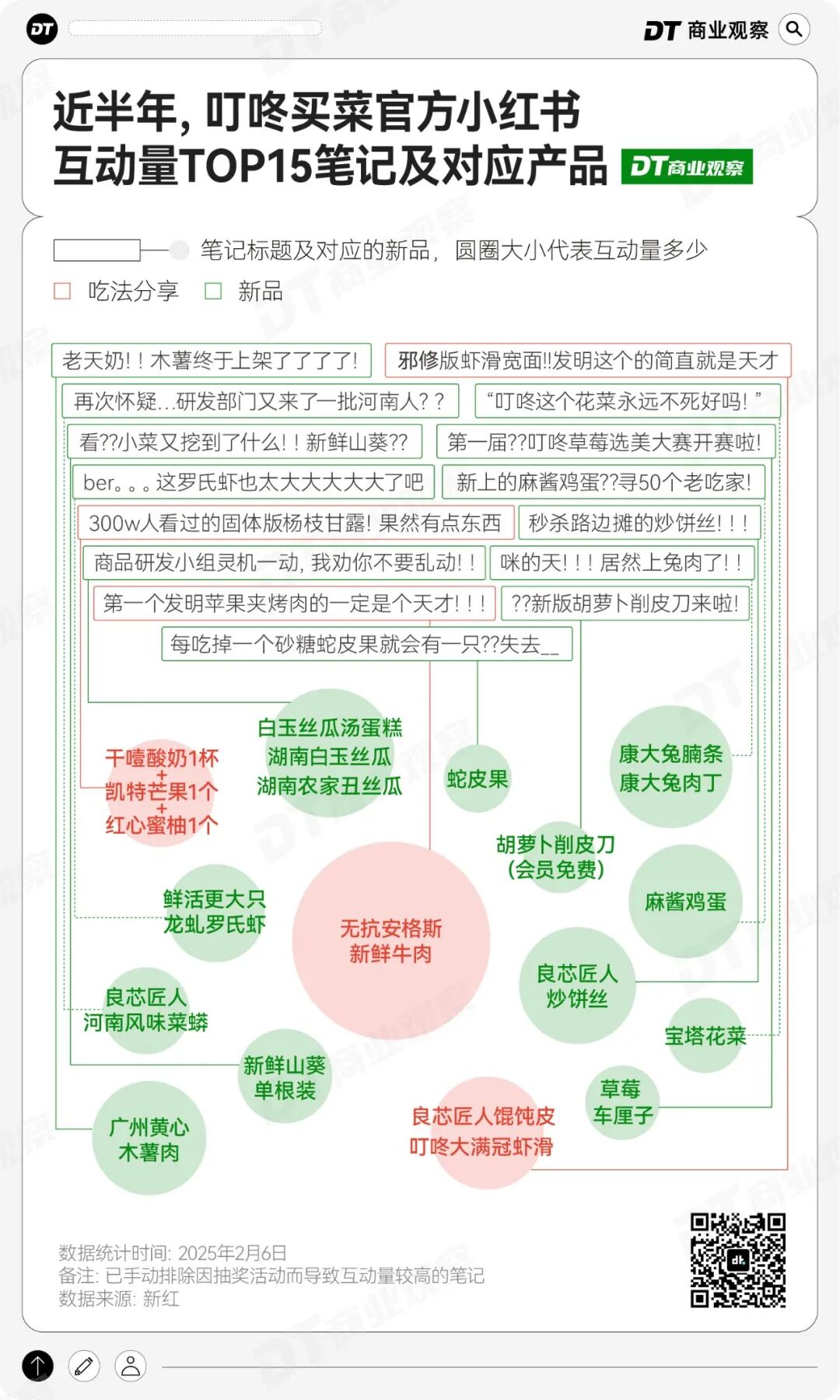这些新品笔记的互动量(点赞、收藏、评论),在一定程度上代表着叮咚买菜用户对这款产品的期待和喜爱。因此,我们统计了近半年来互动量最高的15条笔记,以及它们对应的新品分别是啥,结果发现,互动量高的笔记大致有三类: