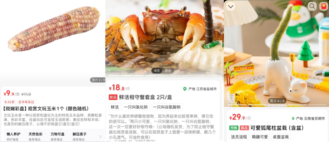 在此之前,叮咚买菜的很多产品都在互联网上引起讨论甚至卖断货,比如9块9的“文玩玉米”、520节点推出的“相守蟹”(学名相手蟹)、各种奇特造型的盆栽……