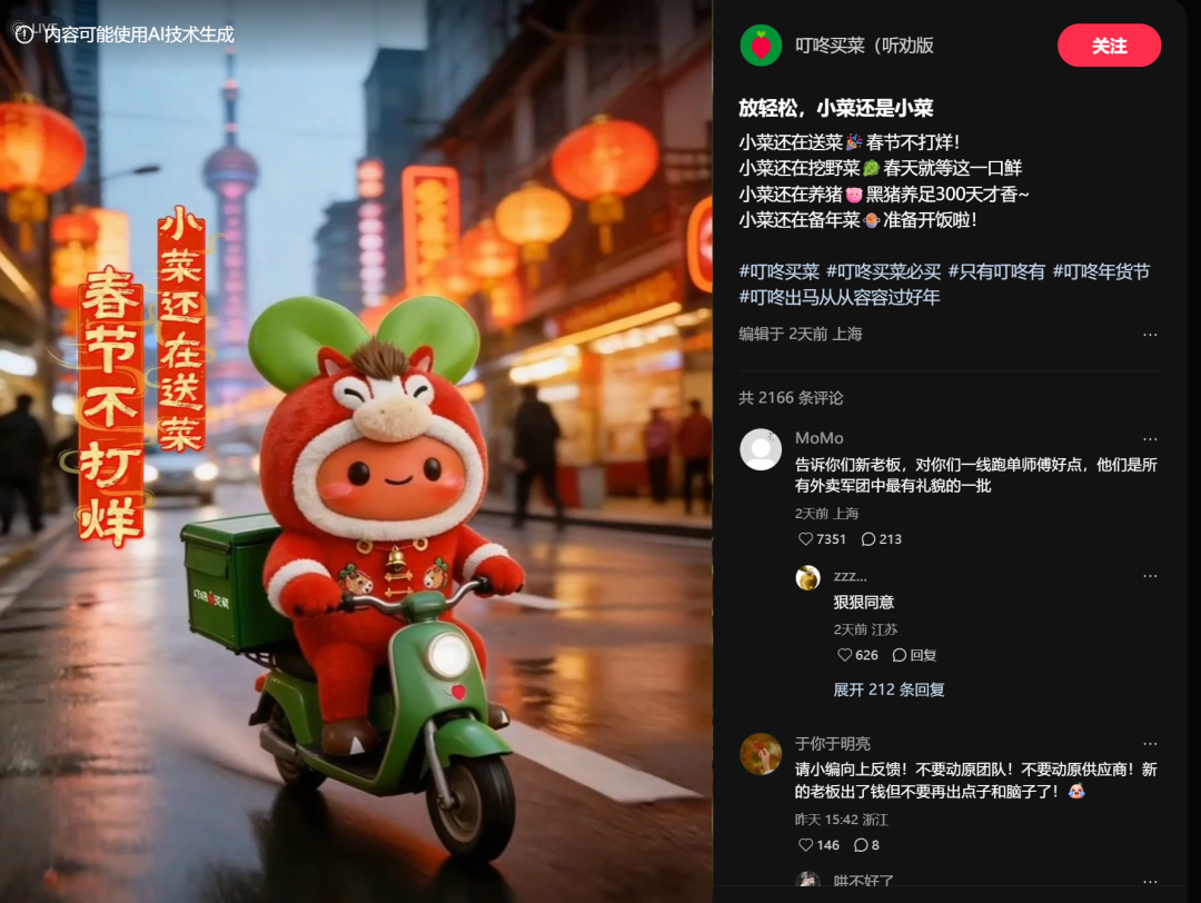 这些充满“网感”“活人感”和“生活气息”的内容,让网友和叮咚买菜的关系愈发亲切,也让网友一次次在叮咚买菜上下单。