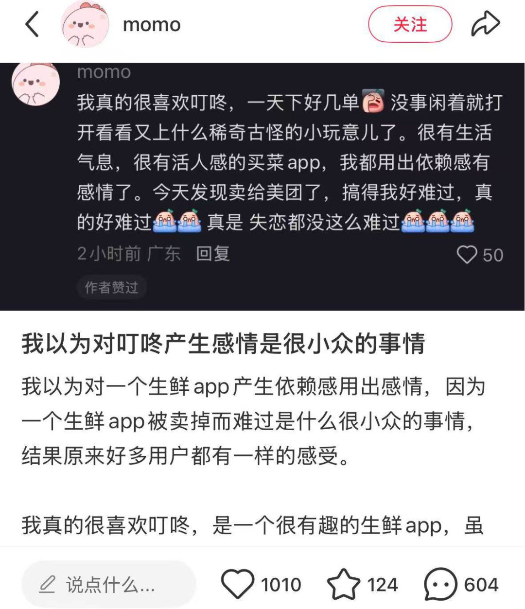 2月5日,小红书@momo发了一篇笔记《我以为对叮咚产生感情是很小众的事情》,起因是自己的一条“我真的很喜欢叮咚,一天下好几单,没事闲着就打开看看又上什么稀奇古怪的小玩意儿了……”的留言被很多人点赞,她才发现原来有这么多人和自己一样对这个APP很有感情。