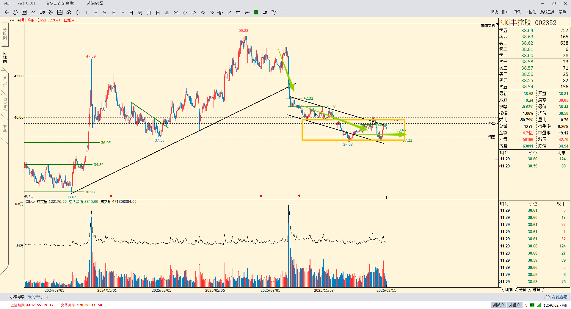 图形上可以看到,随着行情的下跌速度减缓,股价开始在当前区域震荡,这个时候 我们可以画出来横盘整理,也就是37.22-.9.70箱体。