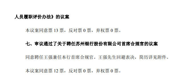 【苏州银行:聘任行长王强兼任首席合规官】2月10日,苏州银行发布《第五届董事会第