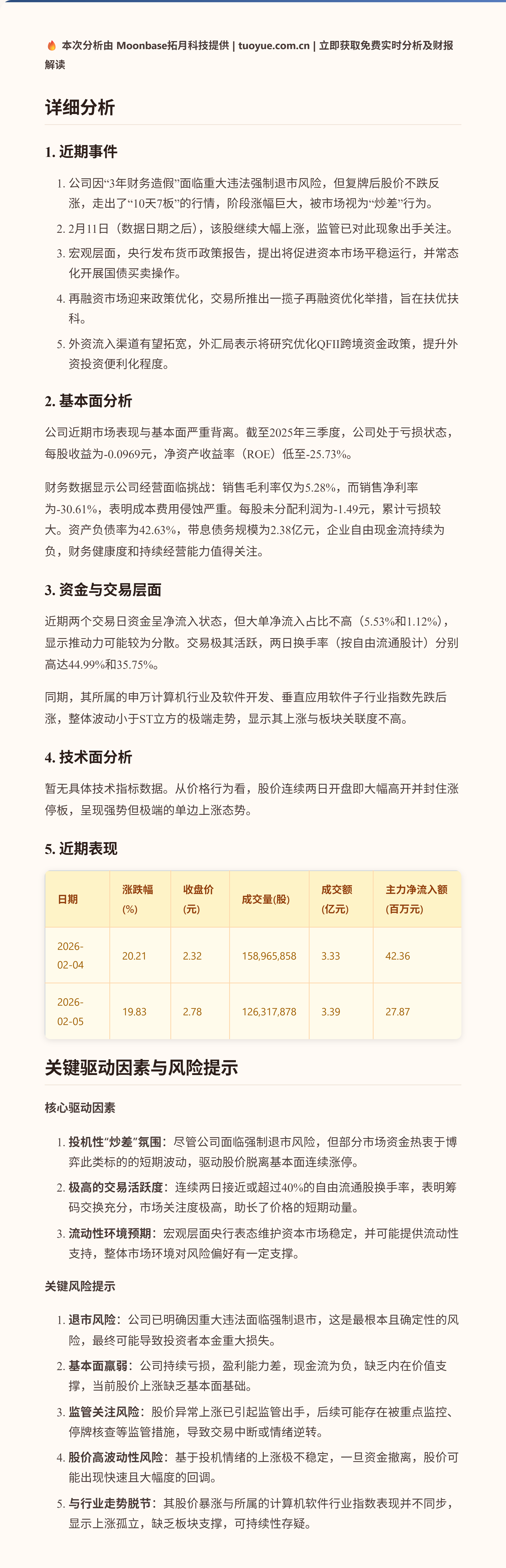 ST立方在2月4日与5日连续两个交易日涨停,累计涨幅超过40%。股价的快速上涨与公司因重大违法面临强制退市风险的基本面形成显著反差,市场交易活跃度极高。关键点在于,这轮上涨行情主要由市场投机性“炒差”行为驱动,而非公司经营状况改善。