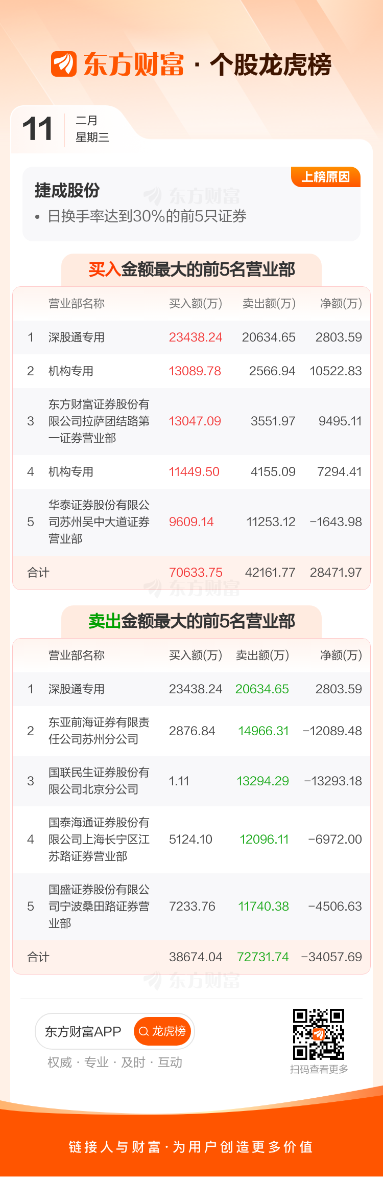 交易所2026年2月11日公布的交易公开信息显示,捷成股份因成为日换手率达到30%的前5只证券上榜。捷成股份当日收报8.85元,涨跌幅4.73%,偏离值50.05%,换手率53.49%,成交额106.72亿。