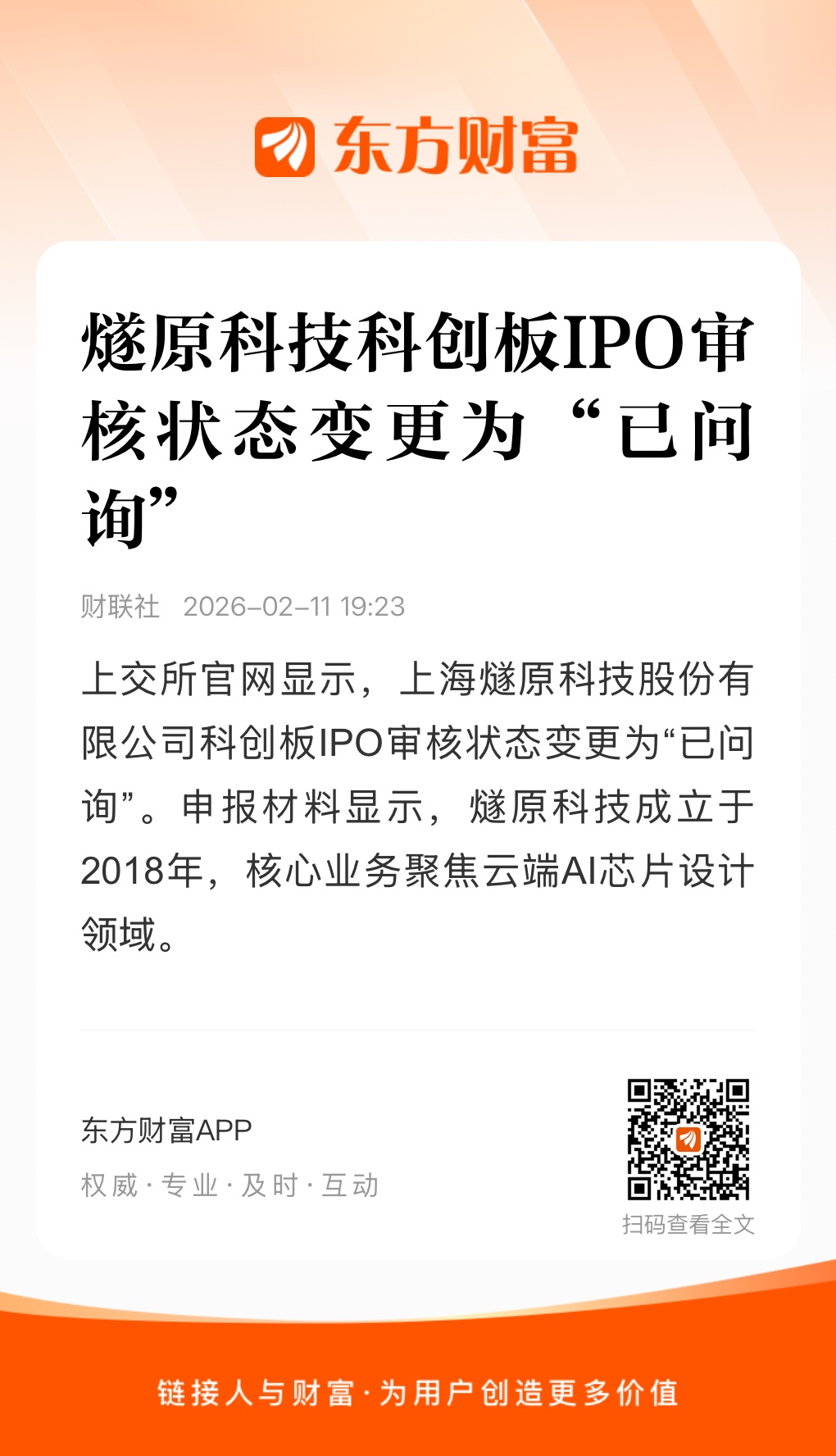 2月11日,上交所官网显示,上海燧原科技股份有限公司(简称“燧原科技”)科创板IPO审核状态变更为“已问询”。