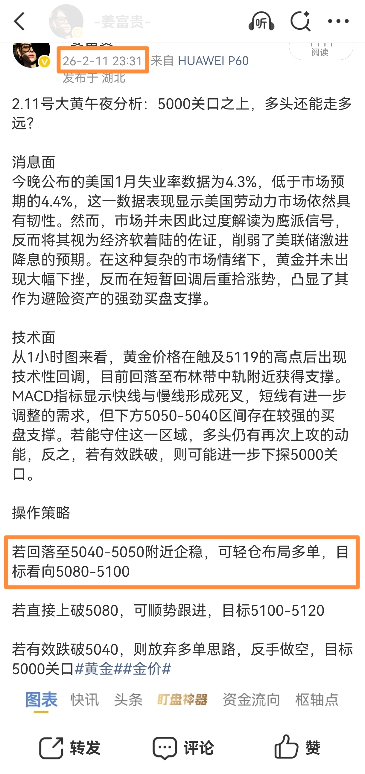 富贵昨晚午夜分析中提示5040-5050的多单布局区间,行情精准回踩后强势拉升,