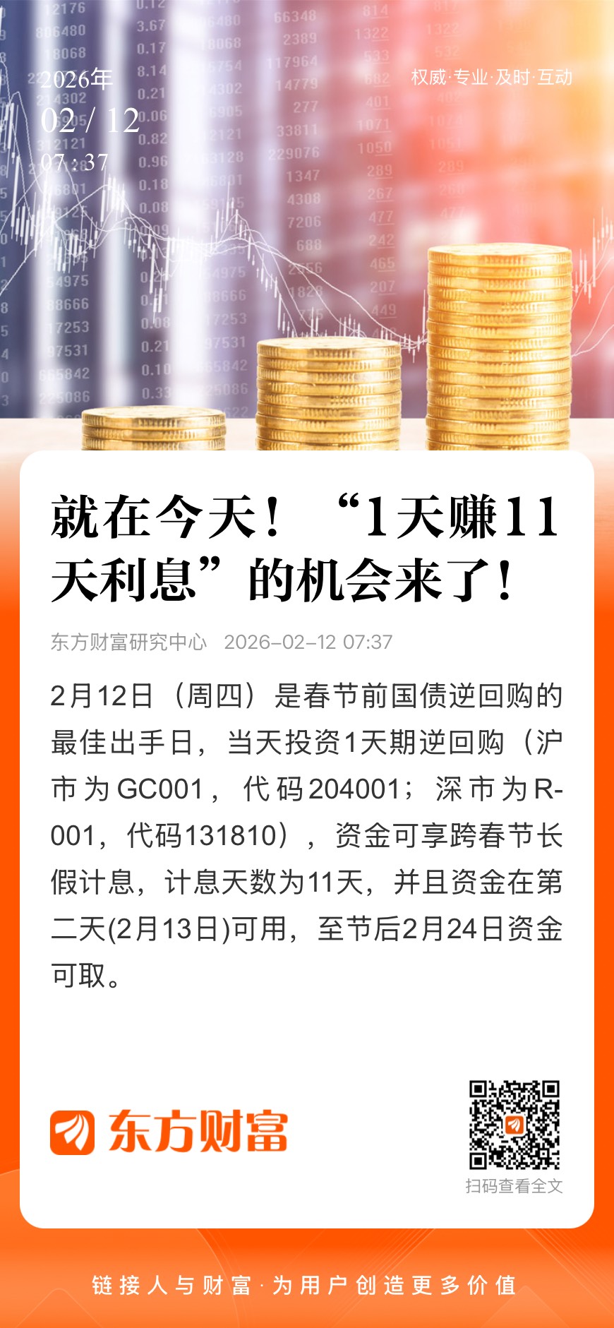 2月12日(周四)是春节前国债逆回购的最佳出手日,当天投资1天期逆回购(沪市为GC001,代码204001;深市为R-001,代码131810),资金可享跨春节长假计息,计息天数为11天,并且资金在第二天(2月13日)可用,至节后2月24日资金可取。