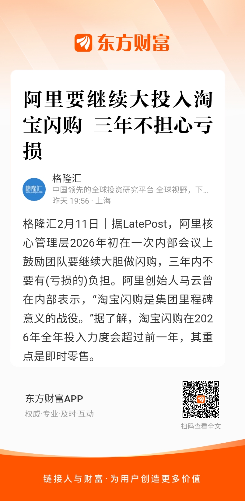 格隆汇2月11日|据LatePost,阿里核心管理层2026年初在一次内部会议上鼓励团队要继续大胆做闪购,三年内不要有(亏损的)负担。阿里创始人马云曾在内部表示,“淘宝闪购是集团里程碑意义的战役。”据了解,淘宝闪购在2026年全年投入力度会超过前一年,其重点是即时零售。