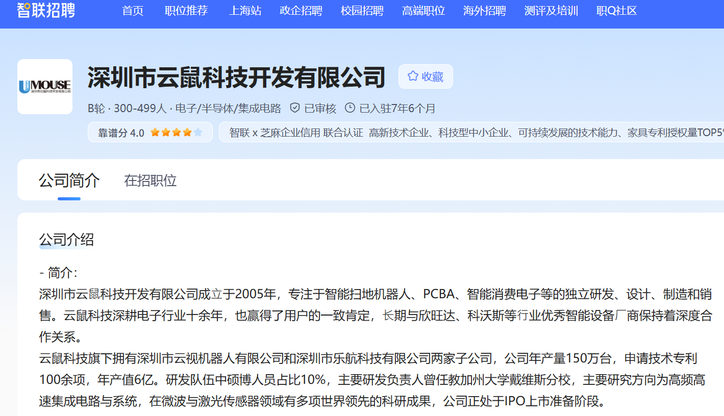 智联招聘平台信息显示,云鼠科技正处于IPO上市准备阶段。
