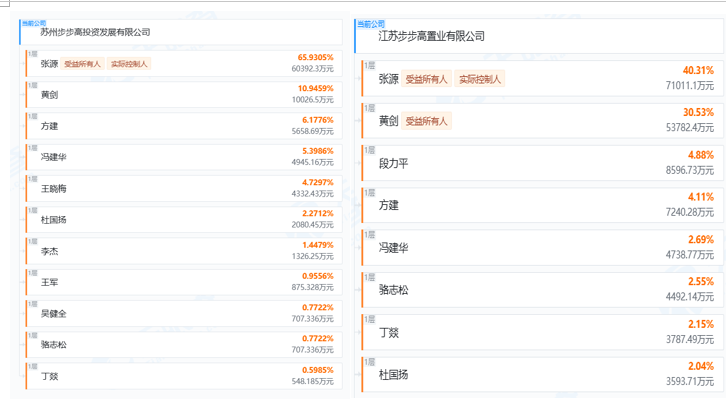 苏州步步高、江苏步步高置业是近一年“步步高系”布局A股市场的主要平台。这两家公司均由张源直接控股,分别持股65.93%、40.31%。