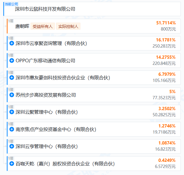 天眼查显示,OPPO广东移动通信为云鼠科技第三大股东,持股14.2755%;苏州步步高为持股5%的第五大股东。