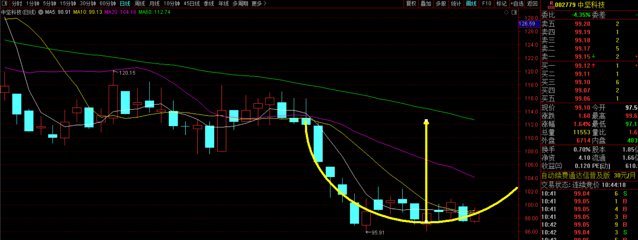 圆弧底,如果后面均线能拐头向上,或者来个放量中阳线,这个圆弧底的确定性就会更高一