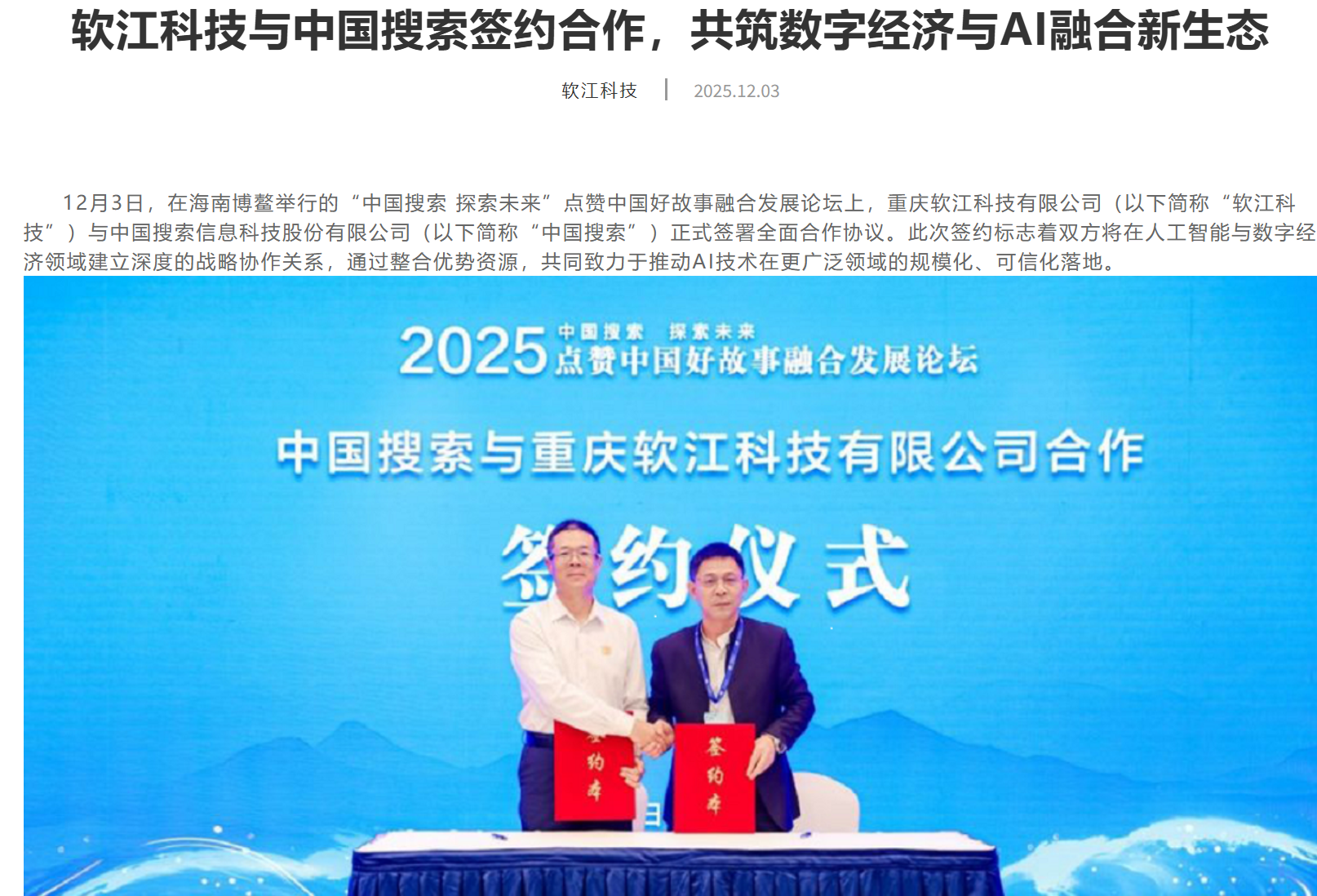 而最重磅的惊天彩蛋——软江图灵借壳预期,现在已经有迹可循!可能有人还不知道软江图灵的实力?看看其关联方软江科技的硬核操作就懂了:2025年11月20日,软江科技与中国移动通信集团重庆有限公司签订战略合作协议(2025世界城市日智慧城市论坛现场签约),强强联合猛攻智慧城市、工业互联网、企业数智化转型赛道;仅半个月后,12月3日又在海南博鳌论坛与中国搜索正式签约,深度布局AI与数字经济融合,推动AI技术规模化、可信化落地!