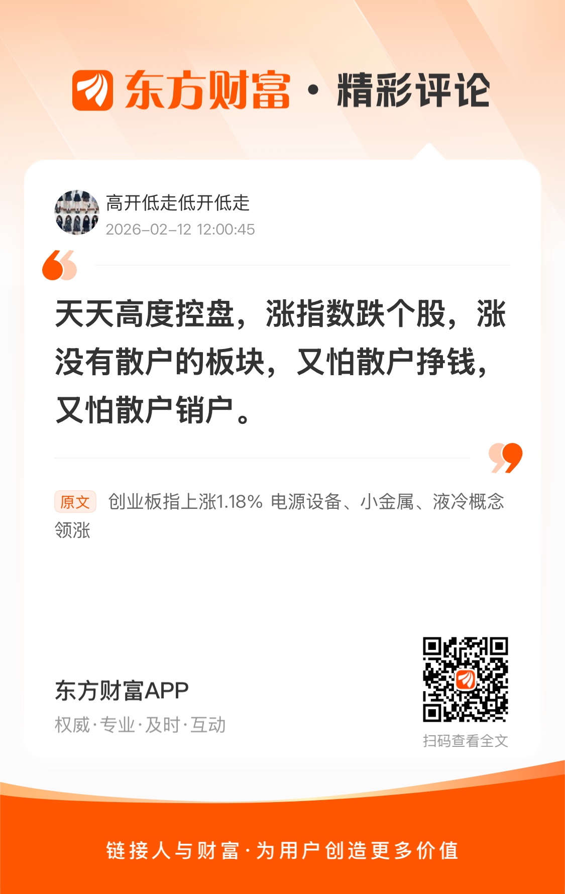 天天高度控盘,涨指数跌个股,涨没有散户的板块,又怕散户挣钱,又怕散户销户。我在《