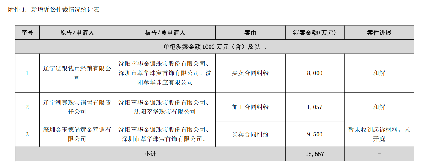 此外,萃华珠宝1月公告,其在过去一年内还有三起作为被告的诉讼案件,均为买卖或加工合同纠纷,涉案金额约1.86亿元,其中两起已和解。