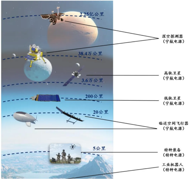 分别为应用于航天器和临近空间飞行器的宇航电源,配备于特种场景的特种电源,以及涵盖光伏、储能市场的新能源应用及服务。