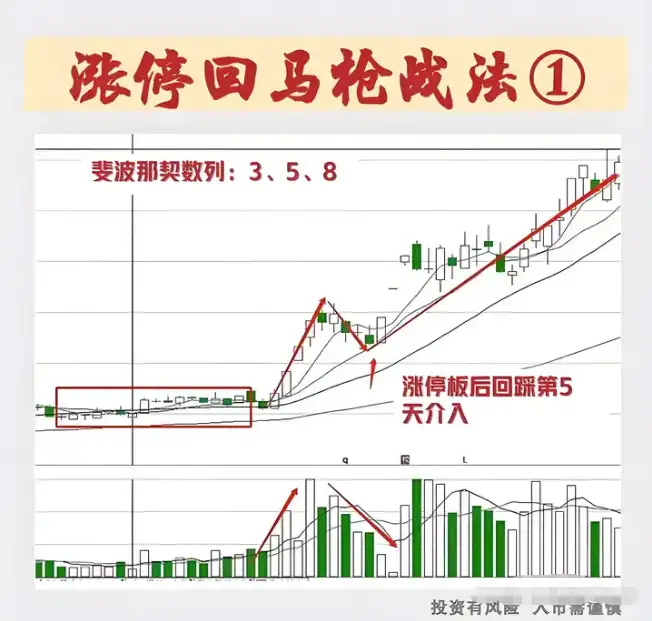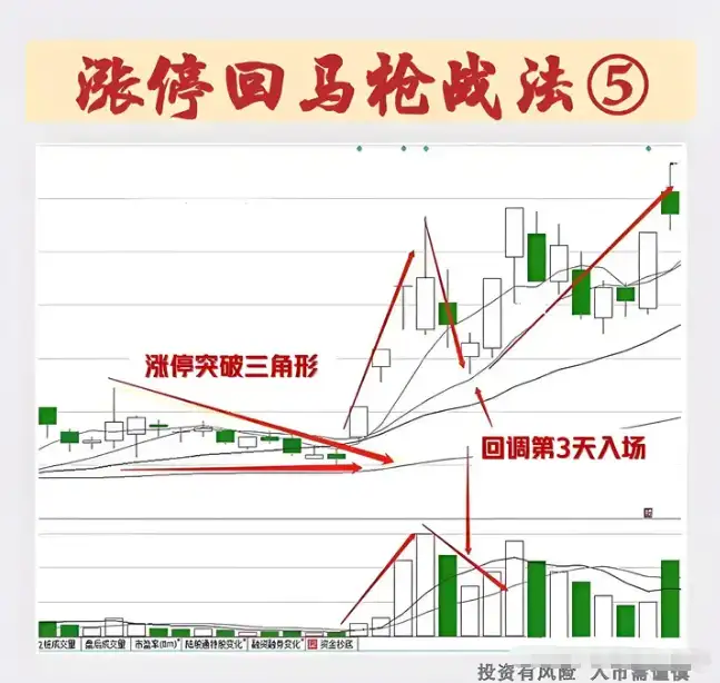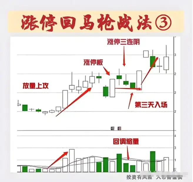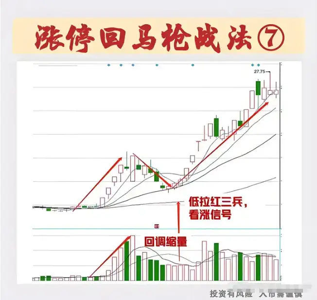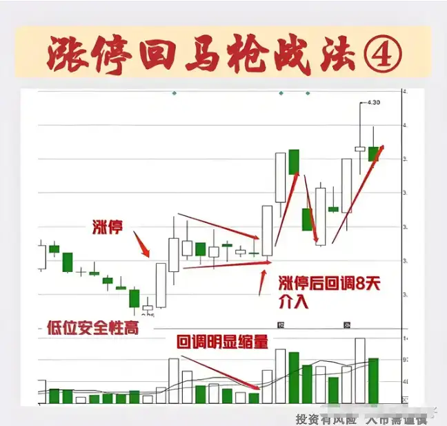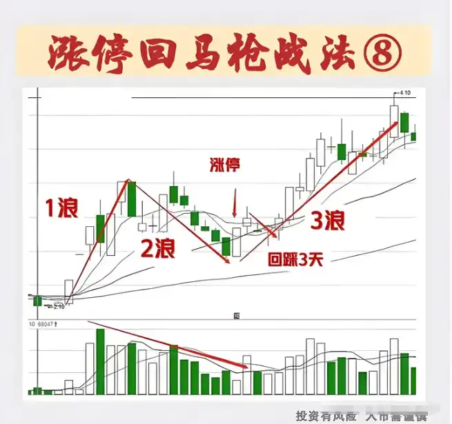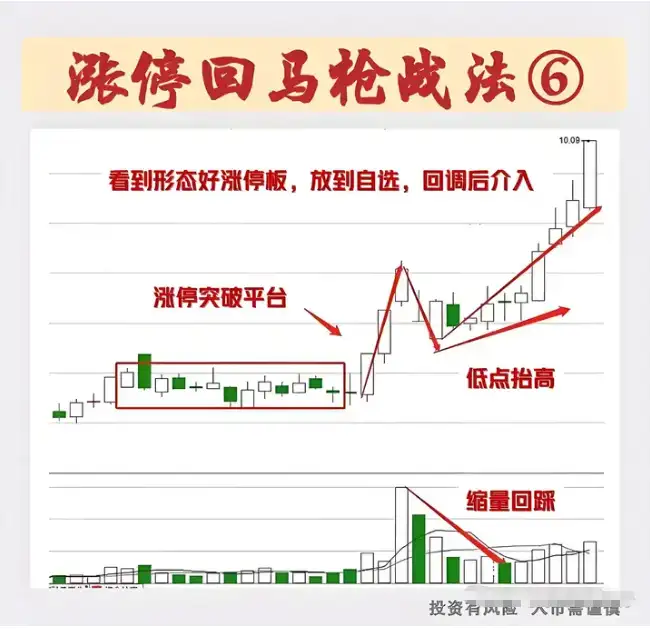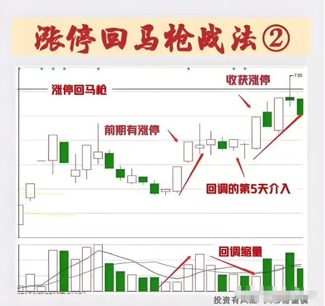 以上6点就是涨停回马枪的核心精髓,只要按照这6点精髓去选,每次逢低进场,逢高出局,正常情况下赚个七八点就可以了,有时候运气好还能连抓几个板。为了方便大家能更好地理解涨停回马枪,我把其精髓结合盘面整理成了图片,建议收藏起来多看几遍,必会有所领悟。