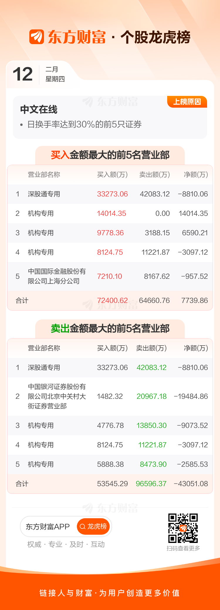 交易所2026年2月12日公布的交易公开信息显示,中文在线因成为日换手率达到30%的前5只证券上榜。中文在线当日收报37.17元,涨跌幅-6.61%,偏离值30.62%,换手率30.65%,成交额76.19亿。