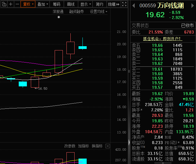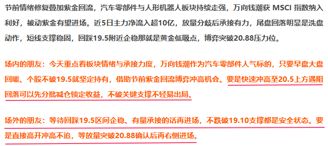 今天低开后小幅回落,随即快速反弹冲高到20.53的位置遇阻回落,全天盘中没有回踩19.5区间企稳,也没有放量突破20.88压力位,仅是尾盘瞬间触低19.56没有形成有效承接,所以继续按原策略等待,不追高、不提前进场。