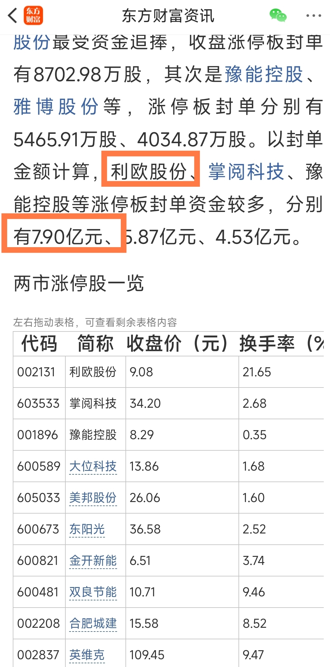 | 代码 | 简称 | 收盘价(元) | 换手率(%) | 涨停板封单(万股) | 封单资金(万元) | 行业 |