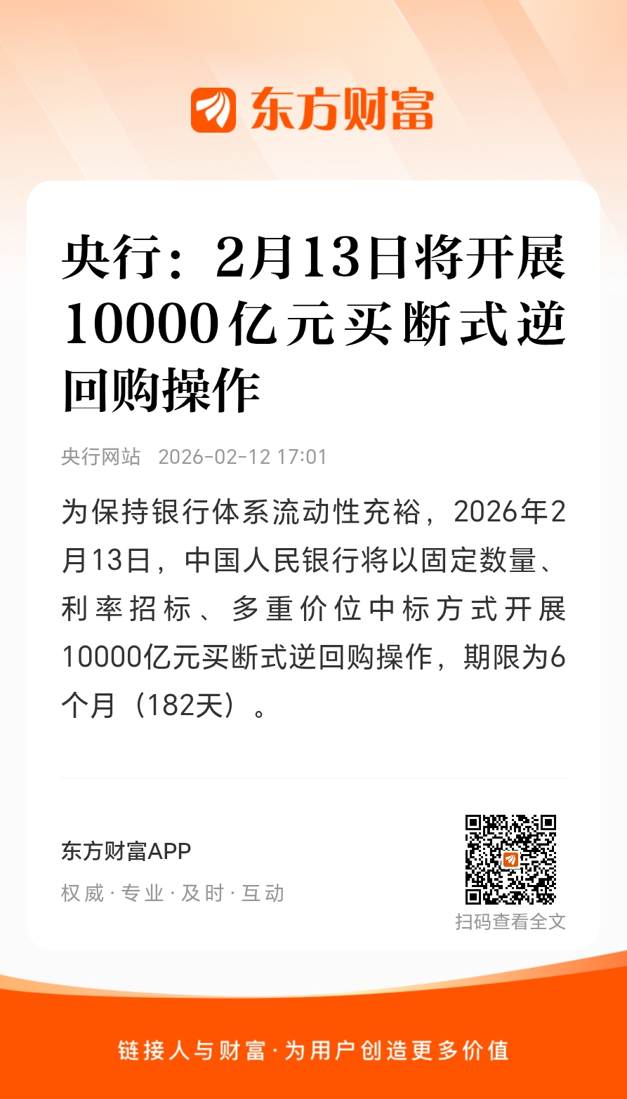 中国人民银行(下称“央行”)2月12日发布公告称,将在13日以固定数量、利率招标、多重价位中标方式开展10000亿元买断式逆回购操作,期限为6个月(182天)。本次操作后,2026年2月央行两个期限品种买断式逆回购均实现加量续作,当月也是央行连续第9个月买断式逆回购净投放。