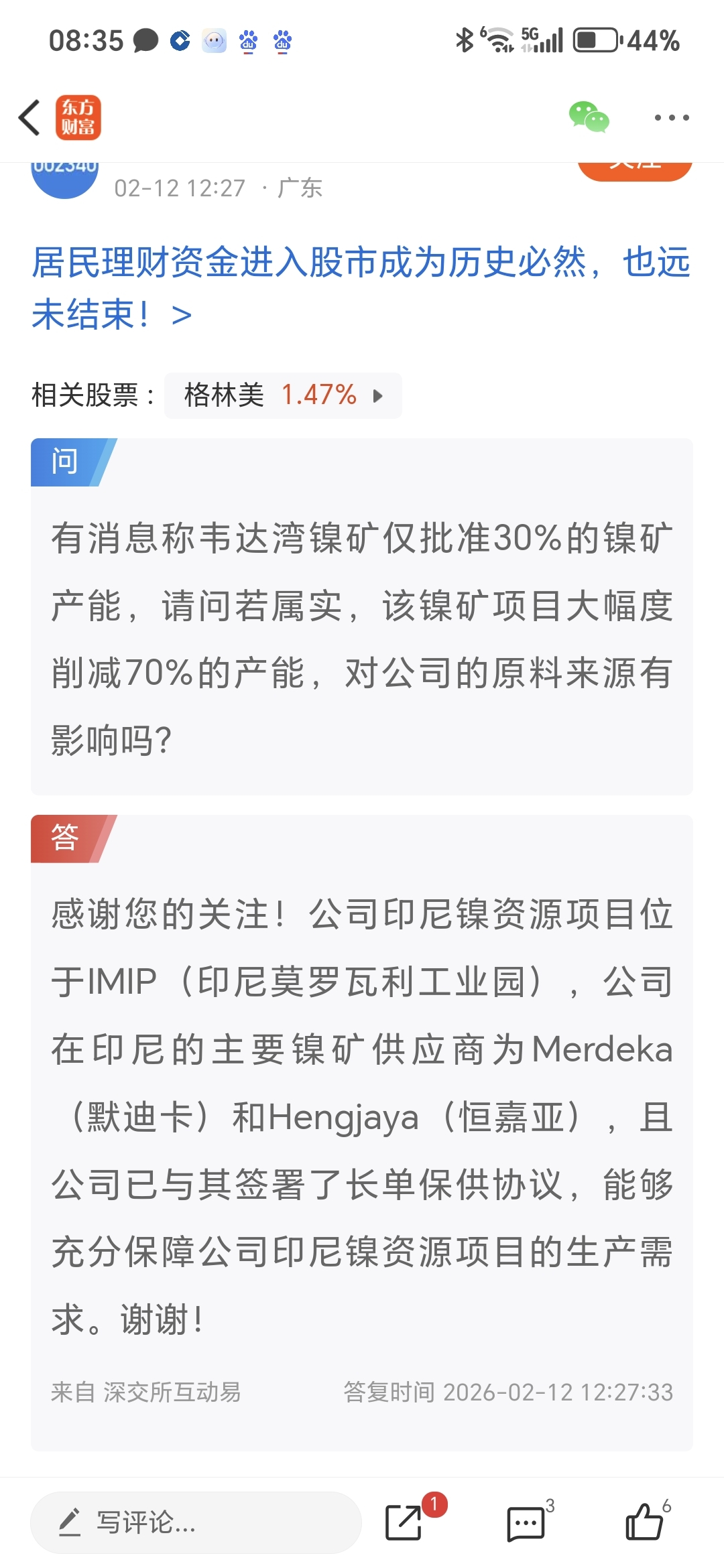值得注意的是,2月12日,格林美回应称,公司在印尼的主要镍矿供应商为Merdeka(默迪卡)和Hengjaya(恒嘉亚),且公司已与其签署了长单保供协议,能够充分保障公司印尼镍资源项目的生产需求。