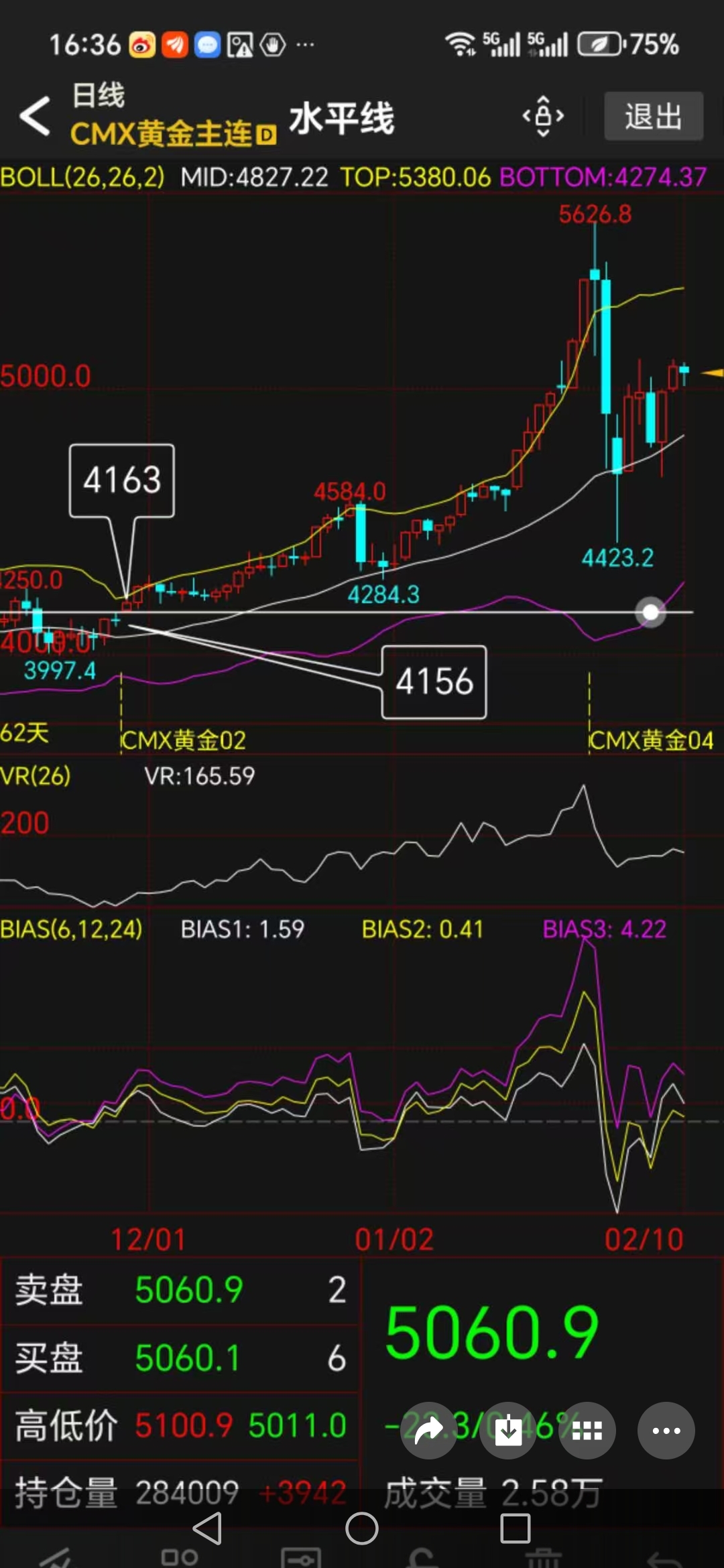 BOLL指标显示,金价中轨位于4827.22,而当前价格仍高居5060附近,处于中轨上方。但BIAS指标已出现分化:BIAS1为1.59,BIAS2仅为0.41,BIAS3则为4.22,这种分化通常预示着上涨动能的衰减。