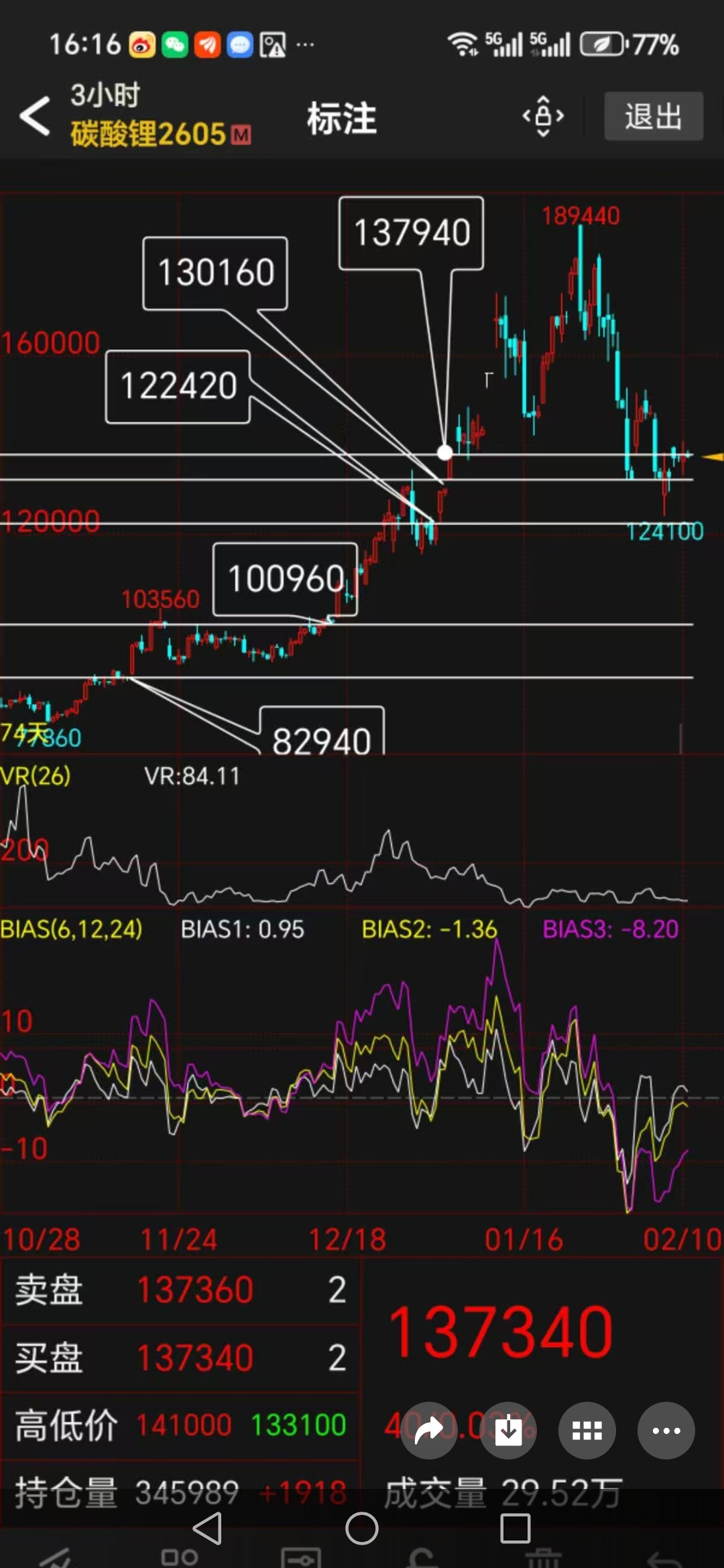 不同贵金属品种的表现已经开始分化。碳酸锂2609合约从190600高点暴跌至124480,反弹至141220后再次走弱。其3小时图显示,VR指标仅为84.11,市场参与度明显不足。