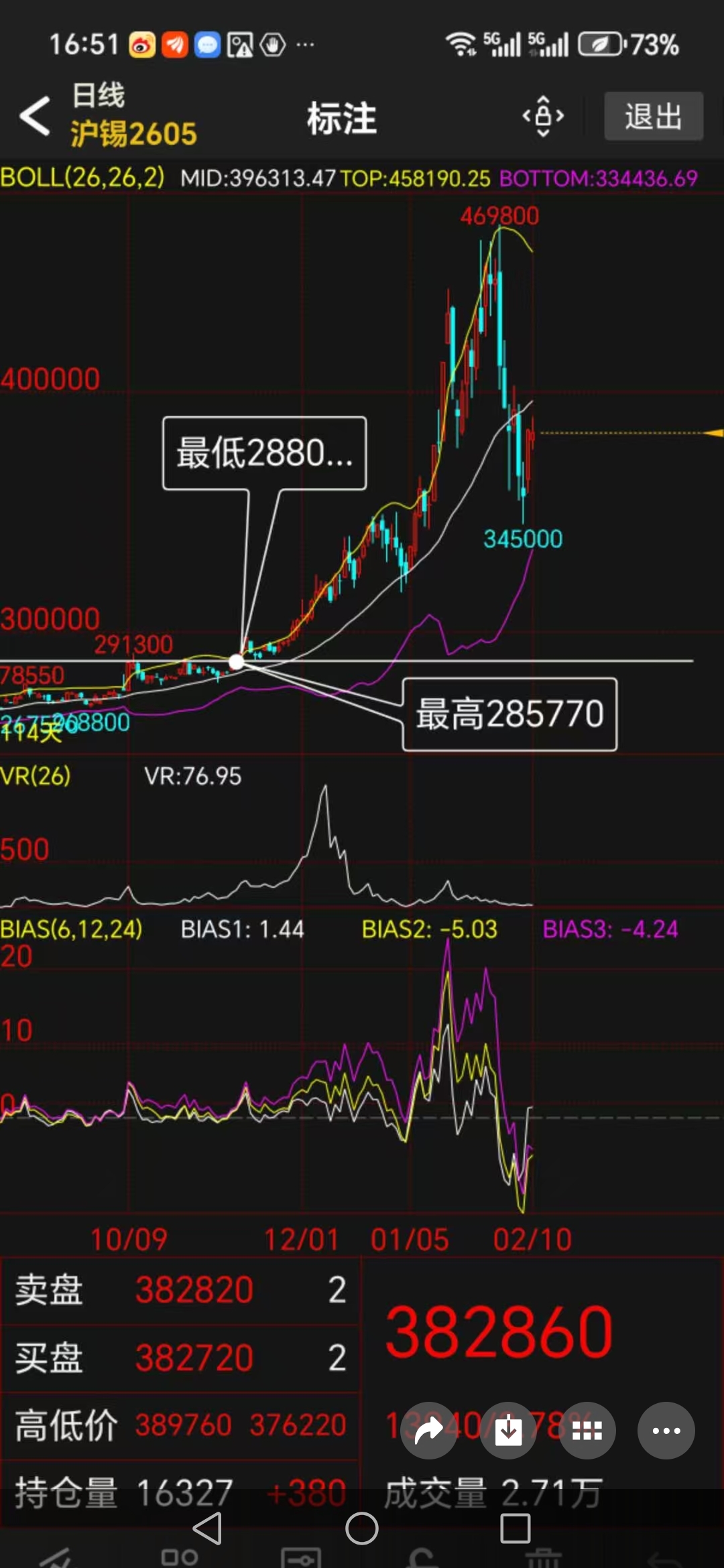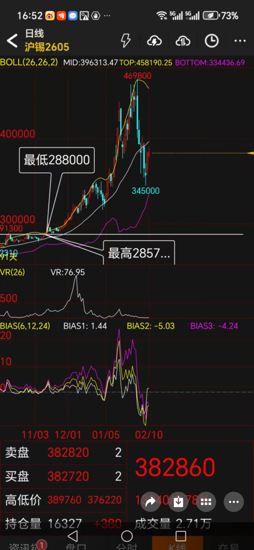 与此同时,沪锡2605合约也呈现类似格局。价格从469800高点坠落至345000,反弹至389760后再次承压。BOLL通道上轨与中轨之间形成的巨大空间,如同一个张开的缺口,贪婪地等待着价格的回归。