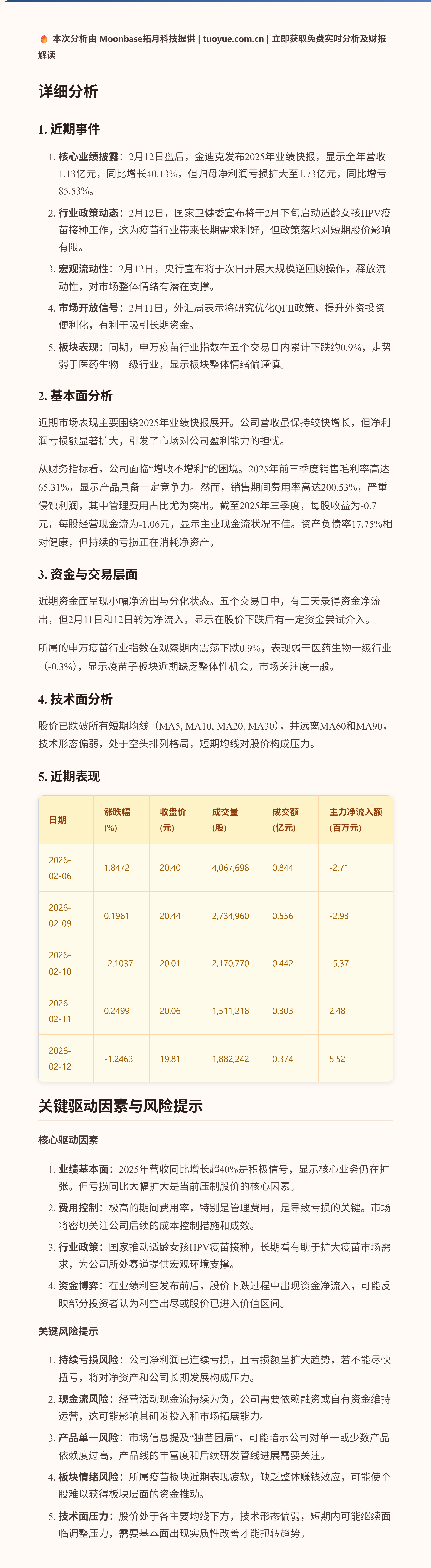 金迪克近期股价在20元附近窄幅震荡,五个交易日内累计下跌约1.1%。股价表现主要受到公司2025年业绩快报披露的持续亏损影响,尽管营收实现增长,但亏损额同比扩大。同时,疫苗行业板块整体表现平淡,未能提供有力支撑。