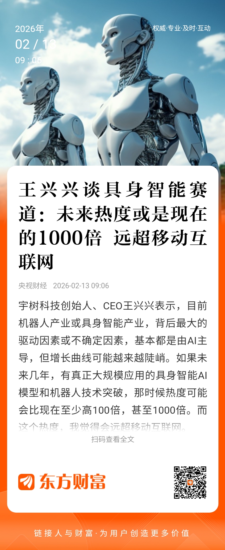 目前,具身智能赛道有多火?对此,宇树科技创始人、CEO王兴兴表示,“目前机器人产业或具身智能产业,背后最大的驱动因素或不确定因素,基本都是由AI主导,但增长曲线可能越来越陡峭。如果未来几年,有真正大规模应用的具身智能AI模型和机器人技术突破,那时候热度可能会比现在至少高100倍,甚至1000倍。而这个热度,我觉得会远超移动互联网。所以,我觉得当下阶段绝对不是最热,目前可能还是处于爬坡或爬坡阶段的平台期。”